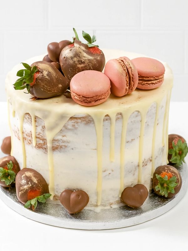Vanilla cake with vanilla butter icing and colour of your choice, topped with macaroons.